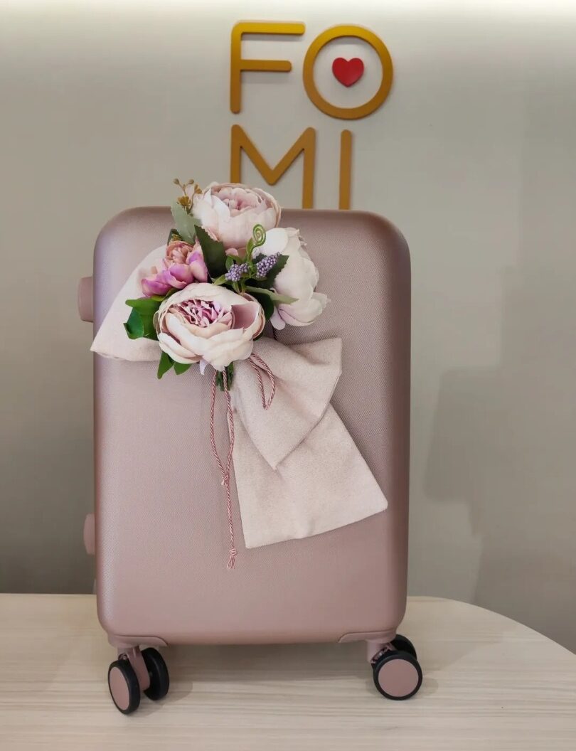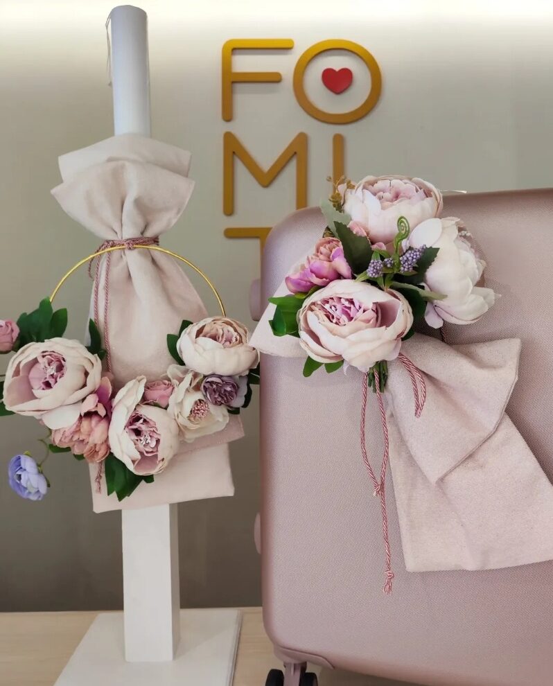 Η λαμπάδα είναι διακοσμημένη με λουλουδένια στοιχεία που χαρίζουν φρεσκάδα και κομψότητα, ενώ η βαλίτσα ακολουθεί την ίδια ρομαντική αισθητική, δημιουργώντας ένα ολοκληρωμένο και αρμονικό αποτέλεσμα. Τα συνοδευτικά αξεσουάρ διατηρούν το ίδιο ύφος, προσθέτοντας μια ιδιαίτερη πινελιά στη σημαντική αυτή ημέρα.