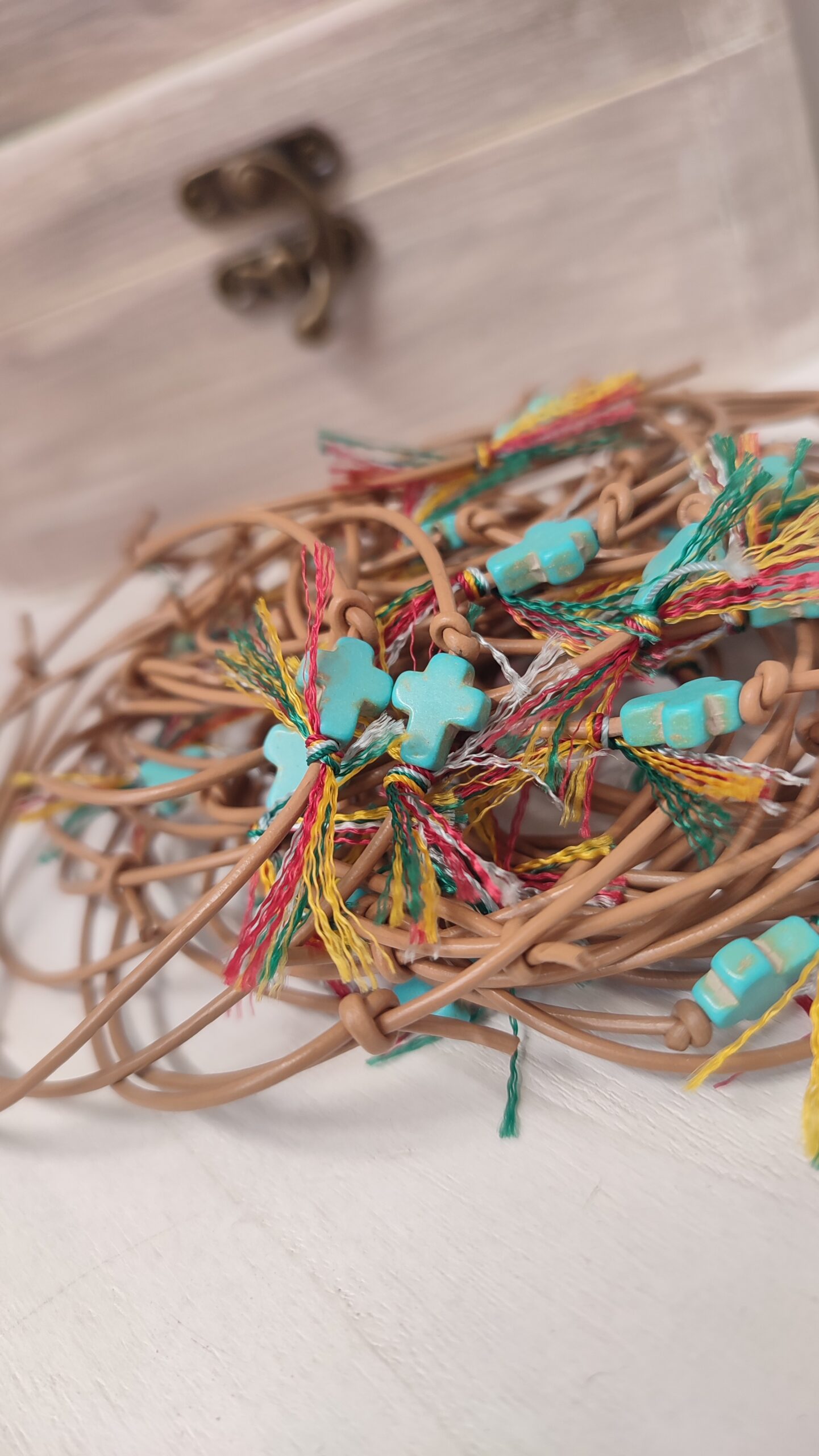 Μαρτυρικό βάπτισης βραχιόλι με κορδόνι δερματίνη και ημιπολύτιμη λίθος Χαολίτη μπλε σε σχήμα σταυρού. Οι πολύχρωμες κλωστές δίνουν μία νότα παιχνιδιάρικη και κάνουν το μαρτυρικό μας ξεχωριστό.
